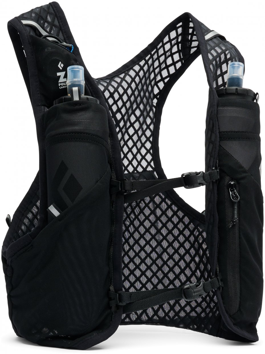 The Black Diamond Distance 2 Vest is the perfect companion for shorter missions that require a smaller (but non-zero) amount of extra equipment. The pass-through lower back pocket is accessible without removing the vest and is perfect for storing extra layers or larger items. The Distance 2 eschews the reservoir sleeve and upper zip pocket found on the Distance 6 and 4 in favor of a pocket-less diamond spacer mesh upper back panel, which offers superb breathability and moisture management for hot days and anaerobic exercise. The front of the vest offers all the classics: two soft flask sleeves, two stretch pockets, and a zip pocket for valuables. Black Diamond's innovative pole carry is also present, allowing you to attach your poles to the pack in front, where they're easy to see and handle, but store them on the back, where they are stable and out of the way. The Distance 2 is the ideal companion for your short or minimalist efforts.